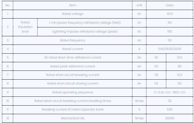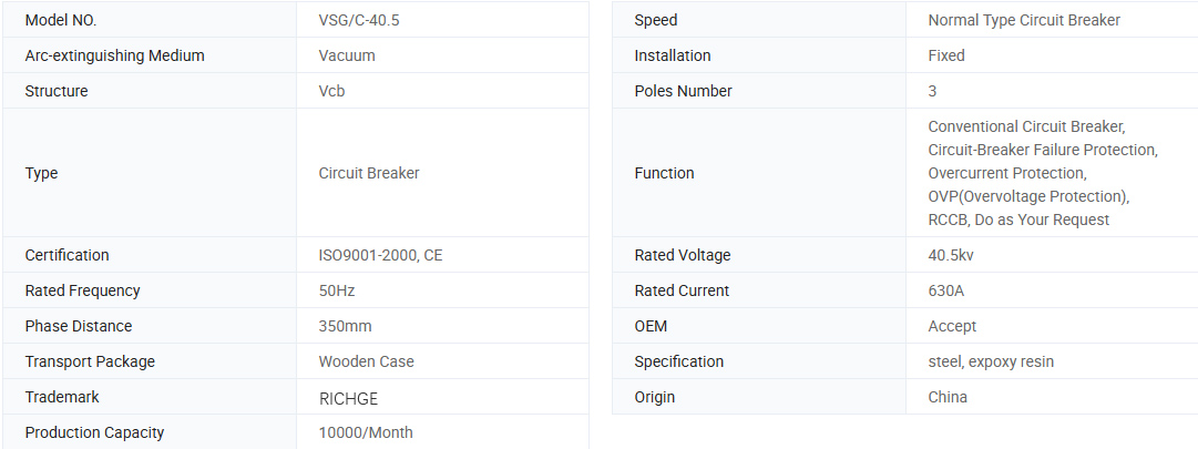 VSG-C/40.5 Πλευρική εγκατάσταση Εσωτερική διακόπτη κενού υψηλής τάσης που χρησιμοποιείται ελατήριο για την ενέργεια αποθήκευσης. Ο μηχανισμός λειτουργίας μπορεί να λειτουργήσει με δύο τρόπους, με χειροκίνητη και ηλεκτρομαγνητική λειτουργία, τα χαρακτηριστικά είναι σύμφωνα με το GB1984-2003 υψηλής τάσης AC Circuit Breaker, JB3855-1996 3.6-4.5KV Εσωτερική AC High Toltage Circuit AC Circuit και IEC Standard 62271-100: 20016271-100: