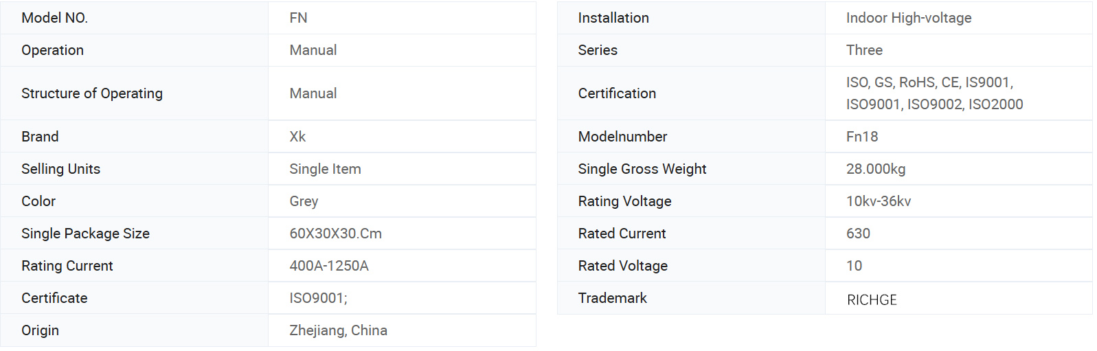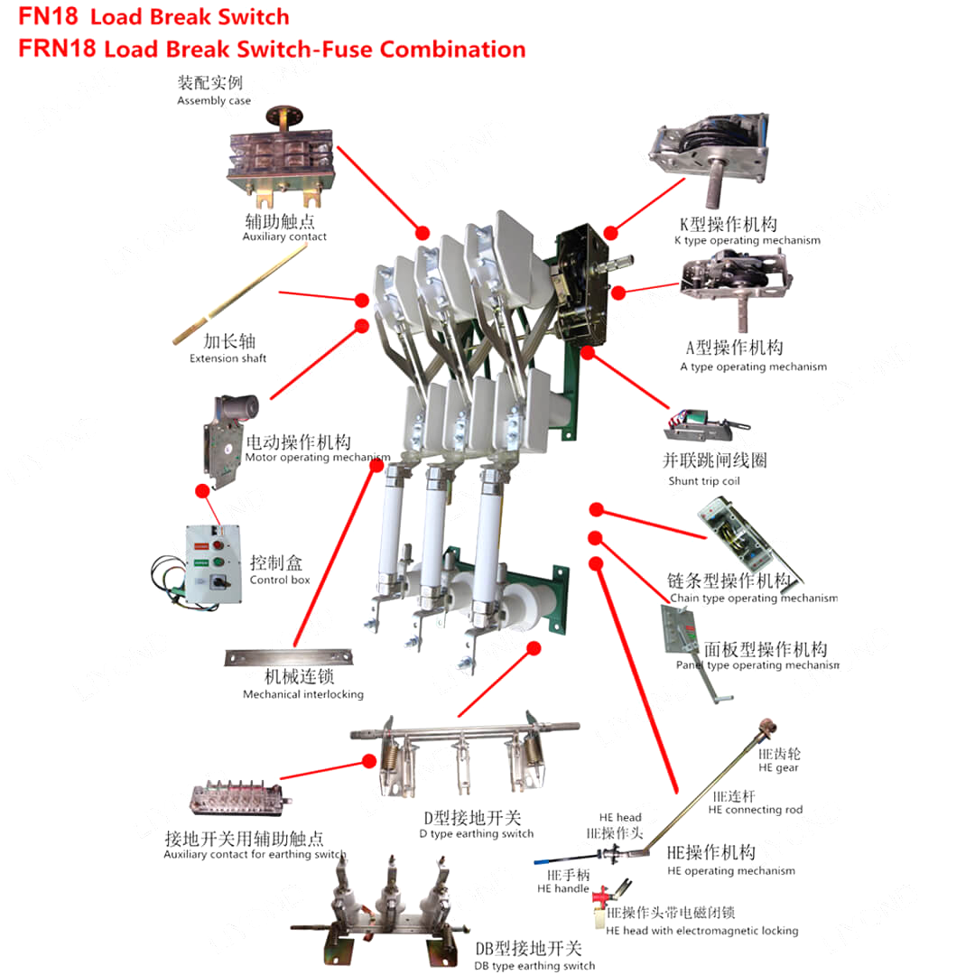 Οι διακόπτες φορτίου FN18 και οι συνδυασμοί διακόπτη φορτίου είναι οι διακόπτες φορτίου υψηλής τάσης, υψηλής απόδοσης που συνδυάζουν την κατάσβεση τόξου συμπιεσμένου αέρα και την κατάσβεση του τόξου. Ο συνδυασμός του διακόπτη φορτίου και της ασφάλειας συνδυάζει τα πλεονεκτήματα του διακόπτη φορτίου με εκείνα της ασφάλειας για να αλλάξει οποιοδήποτε ρεύμα φορτίου μέχρι το ονομαστικό ρεύμα θραύσης του διακόπτη φορτίου και να μεταβεί σε οποιοδήποτε ρεύμα μέχρι το ονομαστικό ρεύμα θραύσης βραχυκυκλώματος του συνδυασμού μέσω της λειτουργίας της ασφάλειας και του εισπρυσμένου του.