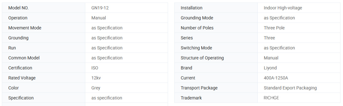GN19-12, 12C Σειρά Εσωτερική Διακόπτη Αποσυνδέσεων Υψηλής Τάσης (εφημερίδες που αναφέρονται ως διακόπτες αποσύνδεσης) είναι εσωτερικές συσκευές με ονομαστική τάση 12kV, τριφασικών AC 60Hz και χρησιμοποιούνται για διαίρεση και κλείσιμο κυκλωμάτων όταν υπάρχει τάση και χωρίς φορτίο.