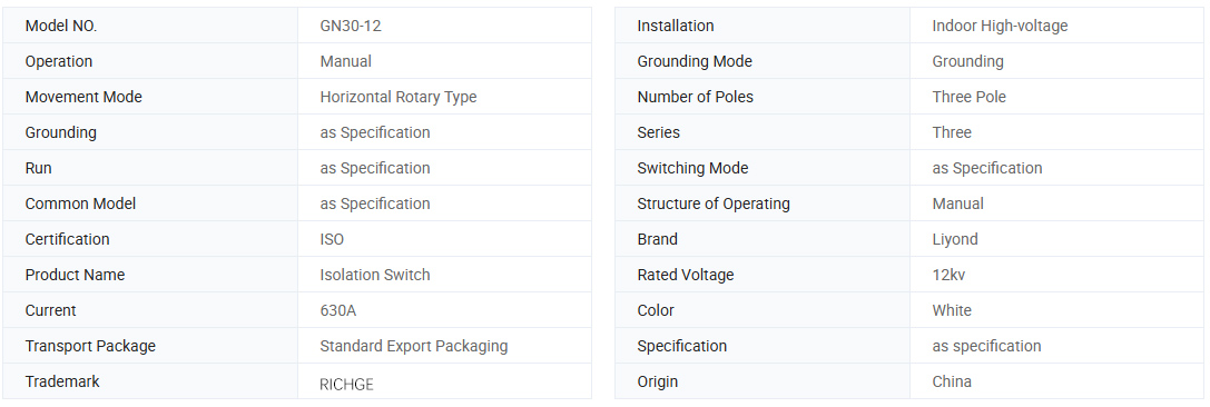 GN30-12 Εσωτερική περιστροφική τάση αποσυνδεδετήρα είναι ένας νέος τύπος με περιστροφικό μαχαίρι. Ο κύριος δομικός τύπος είναι να διορθώσει δύο σετ μονωτήρων και επαφών στα άνω και κάτω επίπεδα του τριών φάσης κοινού χαμηλού πλαισίου, συνειδητοποιώντας το άνοιγμα και το κλείσιμο του διακόπτη περιστρέφοντας το μαχαίρι. Ο διακόπτης GN3-12D προσθέτει μια μορφή σύνδεσης μαχαίρι με βάση το GN30-12 για να καλύψει τις ανάγκες των διαφορετικών συστημάτων ισχύος. Αυτό το προϊόν είναι συμπαγές στο σχεδιασμό, μικρό στο διάστημα, ισχυρό σε μόνωση, εύκολο στην εγκατάσταση και ρύθμιση. Πληροί τις απαιτήσεις του "διακόπτη απομόνωσης υψηλής τάσης AC και του διακόπτη γείωσης" και ισχύει για συστήματα εσωτερικού χώρου με ονομαστική τάση έως 10 kV AC 50 Hz και κάτω. Μπορεί να χρησιμοποιηθεί ως κύκλωμα ανοίγματος και κλεισίματος όταν υπάρχει τάση και χωρίς φορτίο. Μπορεί να χρησιμοποιηθεί με διακόπτη υψηλής τάσης ή μπορεί να χρησιμοποιηθεί μόνη της.