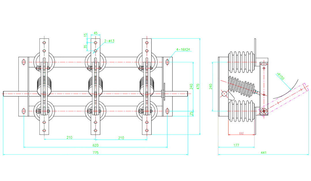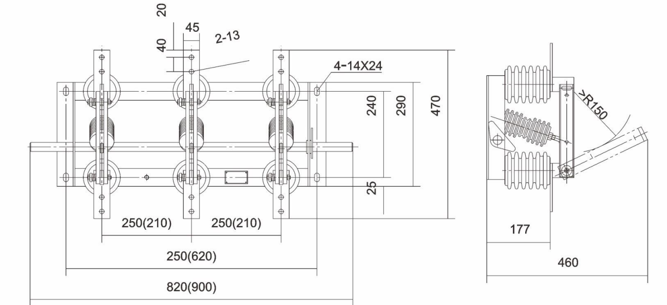 -Διακόπτης απομόνωσης μονής στήλης: Χρησιμοποιήστε απευθείας κατακόρυφο χώρο κάτω από το overhead busbar ως ηλεκτρική μόνωση, χώρο εξοικονόμησης, μείωση των συνδετικών αγωγών και παρέχοντας σαφείς καταστάσεις αποσύνδεσης, ιδιαίτερα κατάλληλες για μετάδοση εξαιρετικά υψηλής τάσης.
