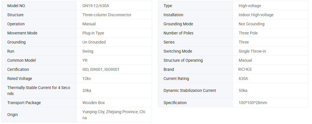 GN19-12 (C) Σειρά Εσωτερική AC Διακόπτης απομόνωσης υψηλής τάσης είναι κατάλληλος για AC 50Hz, ονομαστική τάση εργασίας 12kv, 10kv, ονομαστικό ρεύμα λειτουργίας 400a, 630a, 1250a σύστημα ισχύος, ως τάση και χωρίς φορτίο κάτω από την κατάσταση διάσπασης, κλειστού κυκλώματος διακόπτη. Υπό την προϋπόθεση της τάσης, αλλά χωρίς φορτίο, υπάρχουν επίσης αποστέλλονται για την παραγωγή τύπου αντι-ρύπανσης, τύπου οροπεδίου και ζωντανών συσκευών οθόνης που μπορούν να εγκατασταθούν. Ο διακόπτης απομόνωσης υψηλής τάσης GN19-12 είναι μια εσωτερική συσκευή με ονομαστική τάση 12kV και τριφασικών AC 50Hz.