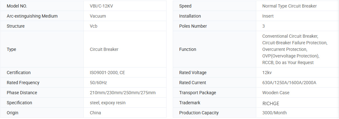 Ο διακόπτης κυκλώματος κενού VBI-12 είναι ένα είδος εξοπλισμού εσωτερικού μεσαίας τάσης με τάσμα 50Hz/60Hz τριών φάσεων AC 12KV βαθμολογίας, η οποία συνδυάζει την τεχνολογία της ABB Corporation στην Ελβετία και αναπτύχθηκε στην Κίνα. Το προϊόν συμμορφώνεται με το πρότυπο GB1984 & IEC62271-100.