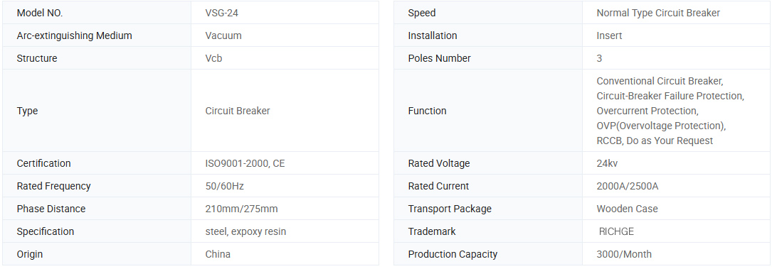 VSG-24 Σειρά διακόπτη κυκλώματος κενού υψηλής τάσης με ενσωματωμένους πόλους είναι τρεις φάσεις A.C 50Hz Εσωτερική κατανομή ισχύος με την ονομαστική τάση 24kV. Χρησιμοποιείται για την προστασία και τον έλεγχο του ηλεκτρικού εξοπλισμού στους τομείς της βιομηχανίας και της επιχείρησης Ming, σταθμών ηλεκτροπαραγωγής και του υποσταθμού.